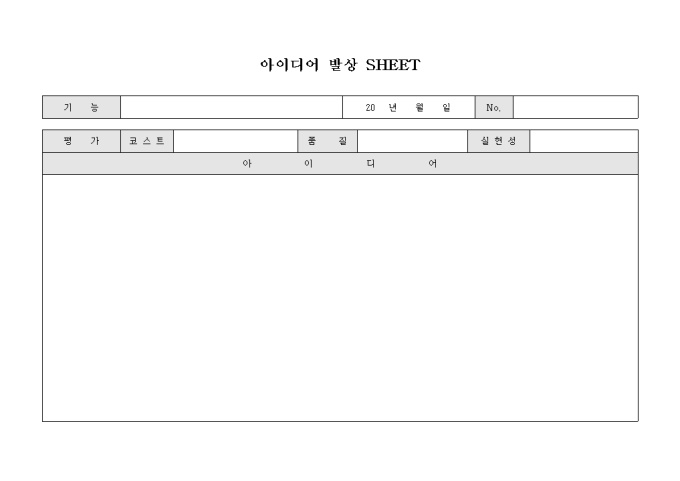 9,000원/월제품의 기능과 제품에 대한 아이디어를 자유로이 기술할 수 있으며 아이디어에 대한 평가 사항도 포함된 아이디어 발상 SHEET 양식입니다.