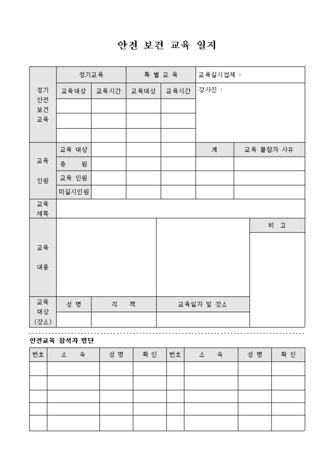 안전 보건에 대한 교육 후 작성하는 서식입니다. 교육대상자들의 명단과 교육내용을 상세하게 기록할 수 있도록 제작되었습니다.