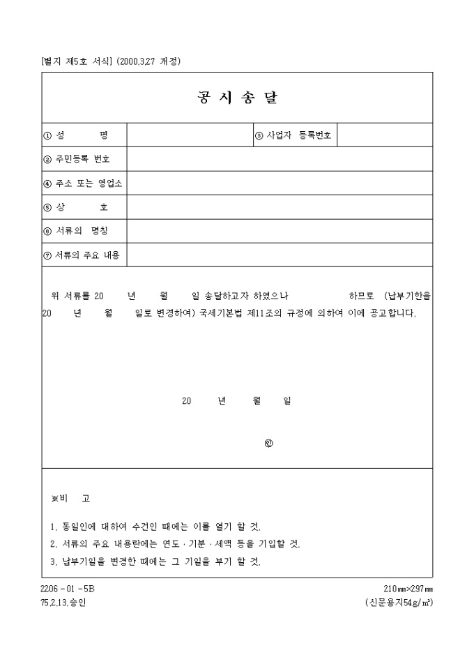 위 서류를 20 년 월 일 송달하고자 하였으나 하므로 (납부기한을 20 년 월 일로 변경하여) 국세기본법 제11조의 규정에 의하여 이에 공고합니다