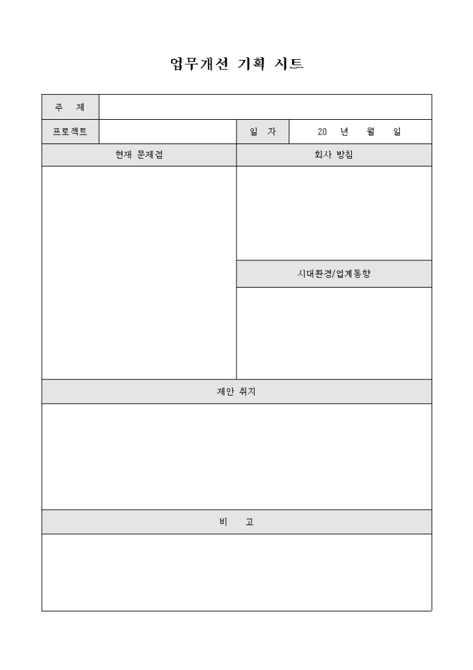 9,000원/월업무의 문제점에 대하여 개선을 위한 업무개선 기획 시트 양식입니다. 업무의 현재 문제점과 회사 방침, 시대환경, 제안 취지 등의 항목을 기재할 수 있습니다.