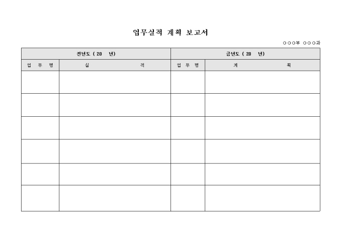 9,000원/월부서의 업무에 대하여 전년도와 금년도에 대한 업무별 실적과 계획을 보고하는 업무실적 계획 보고서 서식입니다.
