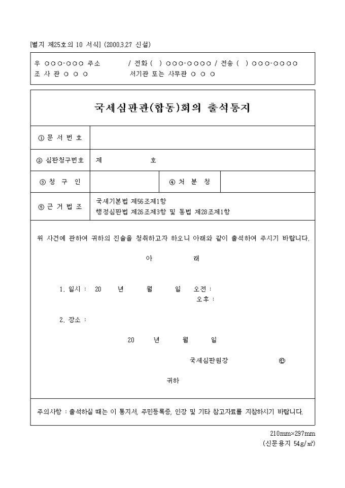 국제심판관,합동회의출석통지 양식입니다.