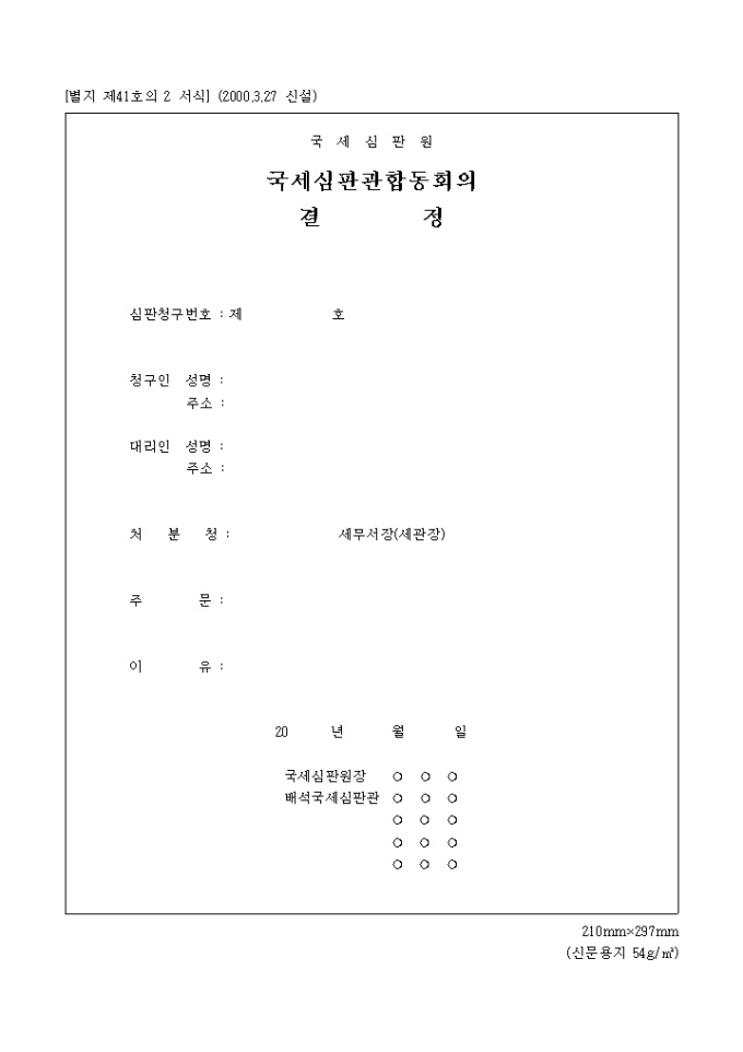 9,000원/월[별지 제41호의 2 서식] 국제심판관합동회의결정 양식입니다. 심판청구번호 : 제 호 청구인 성명 : 주소 : 대리인 성명 : 주소 : 처 분 청 : 세무서장(세관장) ...
