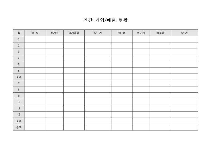 9,000원/월업체에서 연간 발생하는 매입과 매출의 현황을 체계적으로 정리하기 위해 만들어졌으며 부가세, 미지급 금의 항목이 포함된 서식입니다.