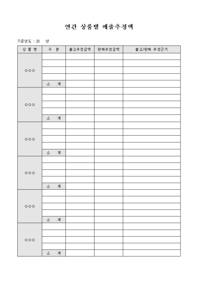 연간 상품별로 출고, 판매 추정금액을 정리하여 산출을 하는데 도움을 주기 위해 만들어졌으며 각각의 금액을 기입하고 그에 따른 산출근거를 기재할 수 있게끔 제작된 서식입니다.