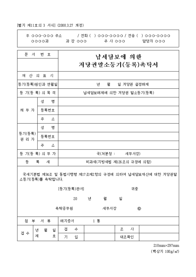납세담보에의한저당권말소등기,등록촉탁서 양식입니다.