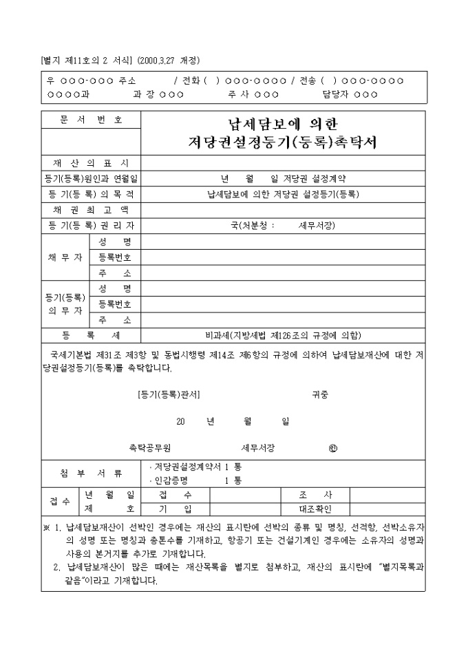 국세기본법 제31조 제3항 및 동법시행령 제14조 제6항의 규정에 의하여 납세담보재산에 대한 저당권설정등기(등록)를 촉탁하실때 사용하는 양식입니다.