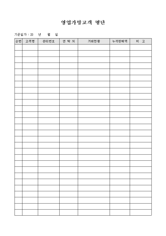 9,000원/월영업을 시행함에 있어서 가망성이 있는 고객에 관한 사항을 정리하고자 할 때 사용할 수 있도록 만들어졌으며 고객 인적사항, 거래현황, 누적판매액 등을 기재할 수 있게끔 제작된 서식입니다.