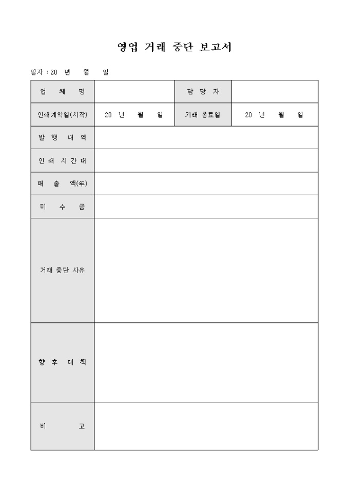 9,000원/월영업 거래와 관련한 거래내역의 중단을 알리고자 할 때 사용할 수 있도록 만들어졌으며 거래중단 사유, 향후 대책 등의 사항을 서술형태로 기재할 수 있게끔 제작된 서식입니다.