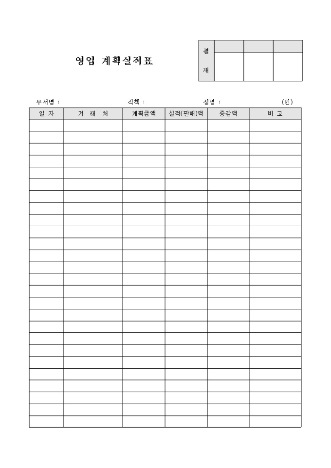9,000원/월거래처별 영업과 관련된 계획금액과 실적금액의 비교가 용이하도록 만들어졌으며 그에 따른 증감액을 정리할 수 있게끔 제작된 서식입니다.