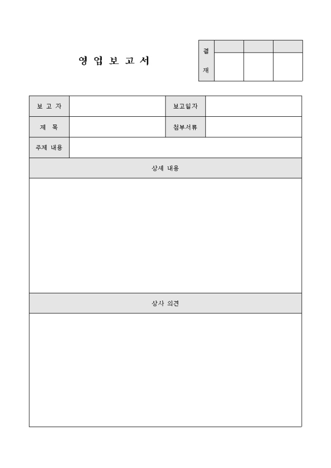 9,000원/월영업에 관한 사항을 작성하여 상부에 보고하고자 할 때 사용할 수 있도록 만들어졌으며 상세 내용 및 상사의 의견을 서술형태로 작성할 수 있게끔 제작된 서식입니다.