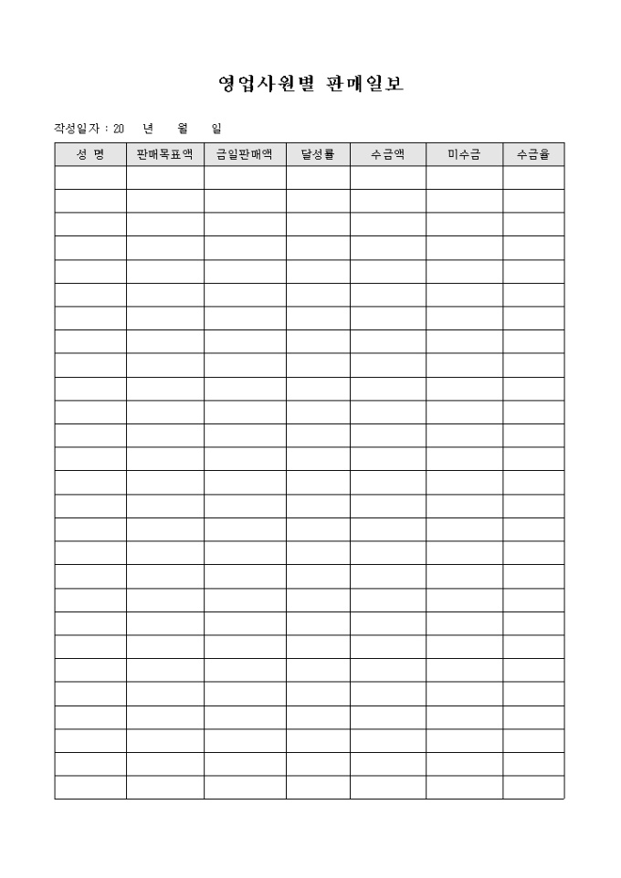 9,000원/월일별 영업사원의 판매 사항을 정리할 수 있도록 만들어졌으며 목표액, 금일 판매액, 수금 등의 항목을 기재할 수 있게끔 제작된 서식입니다.