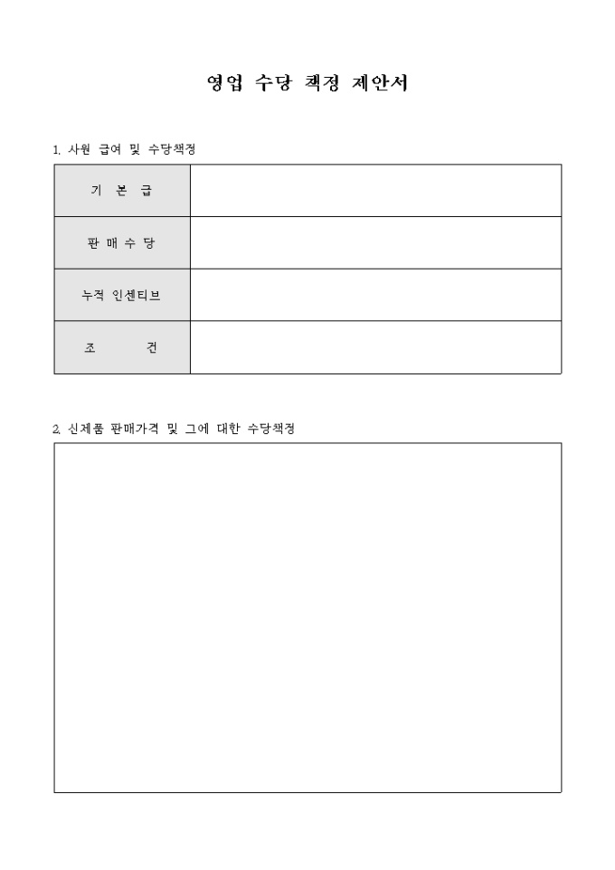 9,000원/월영업 수당 책정과 관련한 의견을 제안하고자 할 때 사용할 수 있도록 만들어졌으며 기본 수당 책정과 판매에 따른 수당의 항목을 기재할 수 있게끔 제작된 서식입니다.