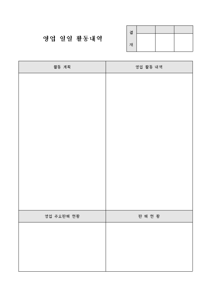 영업과 관련된 일자별 활동에 관한 사항을 정리하고자 할 때 사용할 수 있도록 만들어졌으며 활동 계획과 영업 활동 내역을 서술형태로 작성할 수 있도록 제작된 서식입니다.