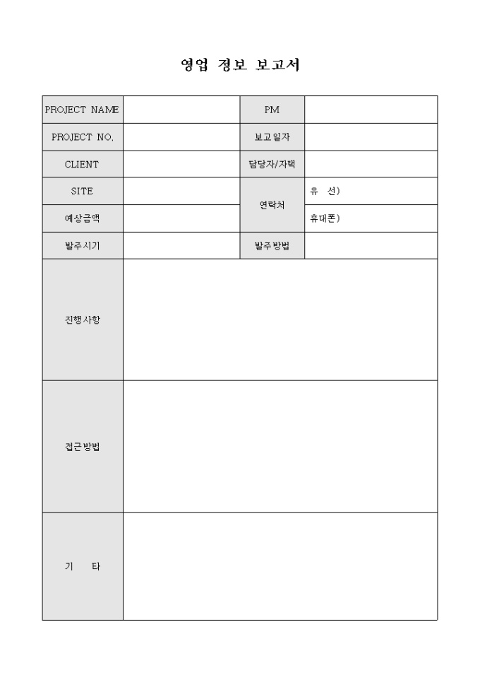 영업과 관련된 정보를 보고하고자 할 때 사용할 수 있도록 만들어졌으며 프로젝트에 관한 사항, 진행사항, 접근방법 등의 항목을 기재할 수 있게끔 제작된 서식입니다.