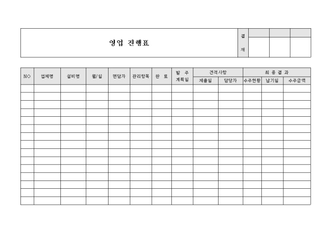 9,000원/월영업의 진행 상태를 정리하고자 할 때 사용할 수 있도록 만들어졌으며 업체에 관한 사항, 견적사항, 최종결과 등을 기재할 수 있게끔 제작된 서식입니다.