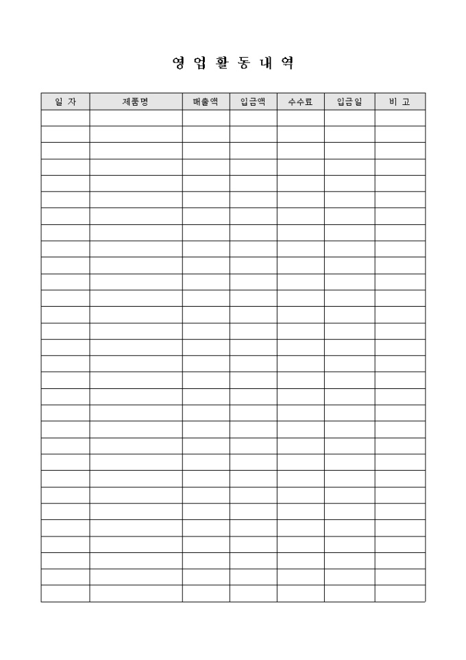 9,000원/월영업 활동 내역을 정리하고자 할 때 사용할 수 있도록 만들어졌으며 제품 관련 정보, 매출액, 입금과 관련된 항목 등을 기재하여 사용할 수 있게끔 제작된 서식입니다.