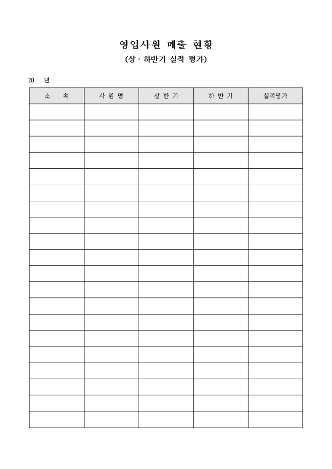 영업사원별 실적을 평가하고자 할 때 사용할 수 있도록 만들어졌으며 상, 하반기 매출 실적과 그에 따른 평가를 기재할 수 있도록 제작된 서식입니다.