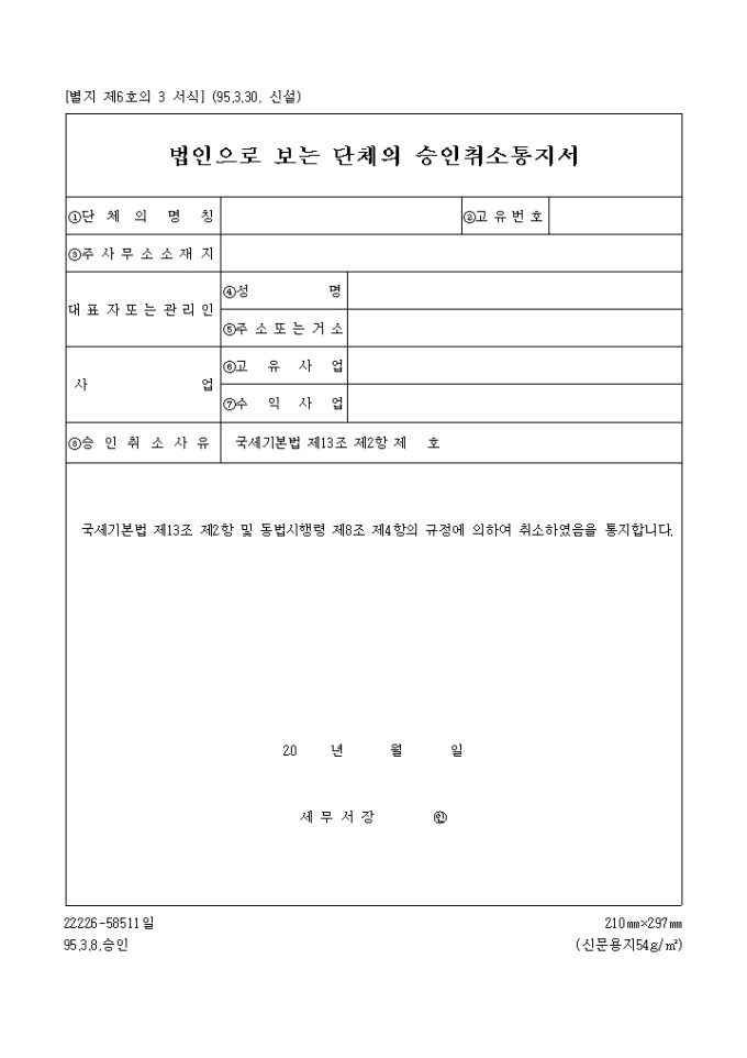 [별지 제6호의 3 서식] 법인단체의승인취소통지서 양식입니다. 국세기본법 제13조 제2항 및 동법시행령 제8조 제4항의 규정에 의하여 취소하였음을 통지하실때 사용하는 양식입니다.