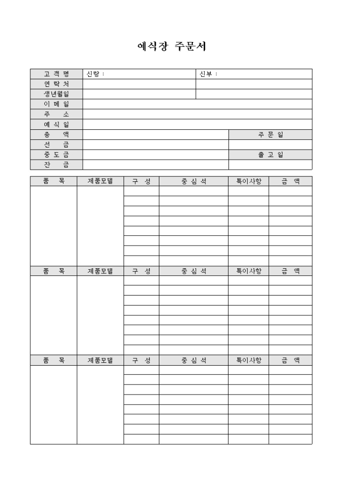 9,000원/월예식장을 대여하기 위하여 작성하는 예식장 주문서 양식으로 해당인원의 인적사항과 예식일, 총액 등의 사항을 기재하고 예식장의 홀별 구성과 금액에 대하여 기재할 수 있습니다.