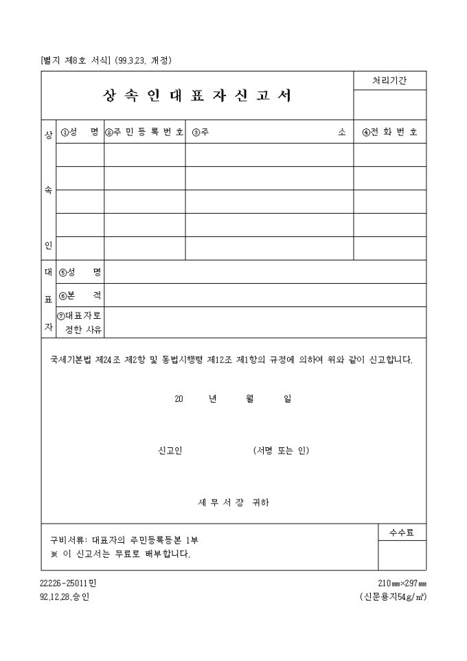 국세기본법 제24조 제2항 및 동법시행령 제12조 제1항의 규정에 의하여 위와 같이 신고하실때 사용하는 양식입니다.