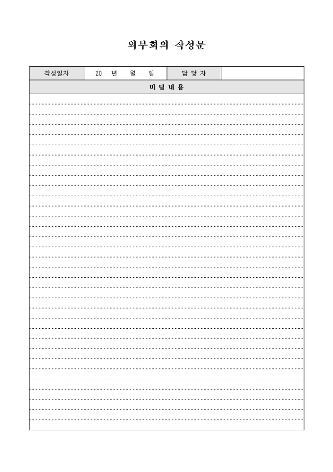 외부 회의에 대한 내용을 서술형식으로 기재할 수 있도록 구성된 외부회의 작성문 양식입니다.
