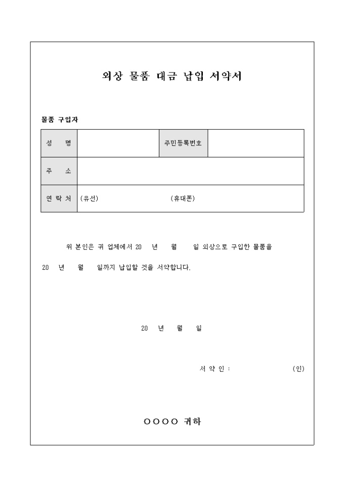 9,000원/월외상으로 구입한 물품에 대하여 물품 대금을 기한 내에 납입할 것을 서약하는 외상 물품 대금 납입 서약서 양식입니다.