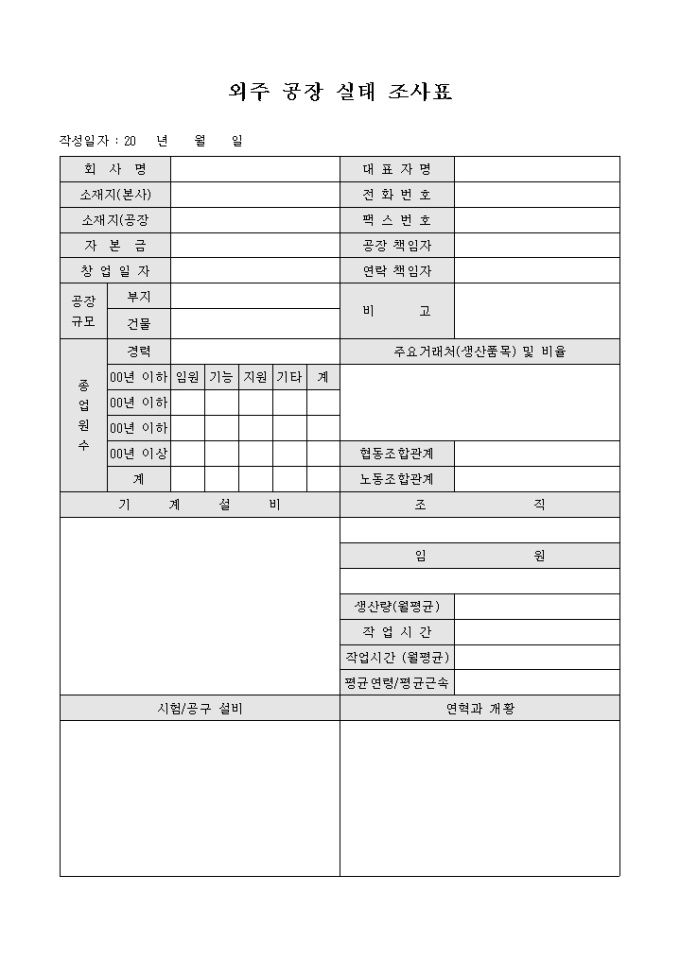 9,000원/월외주 거래 업체의 공장 실태를 알기 위해 작성하는 외주 공장 실태 조사표 양식입니다. 외주 업체의 기본사항과 공장규모, 종업원수, 주요 거래처, 기계 설비, 시험/공구 설비 등의 사항을 기재할 수 있습니다.