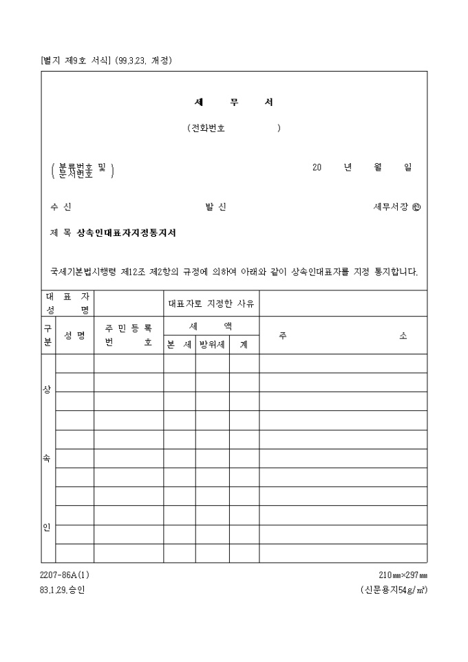 9,000원/월[별지 제9호 서식] 상속인대표자지정통지서 양식입니다. 국세기본법시행령 제12조 제2항의 규정에 의하여 아래와 같이 상속인대표자를 지정 통지하실때 사용하는 양식입니다.