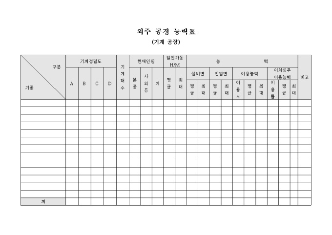 외주 공장의 공정 능력을 알아보기 위하여 작성하는 외주 공정 능력표 양식으로 기계의 기종별 정밀도, 대수, 현재인원, 공정 능력 등의 사항을 기재할 수 있습니다.