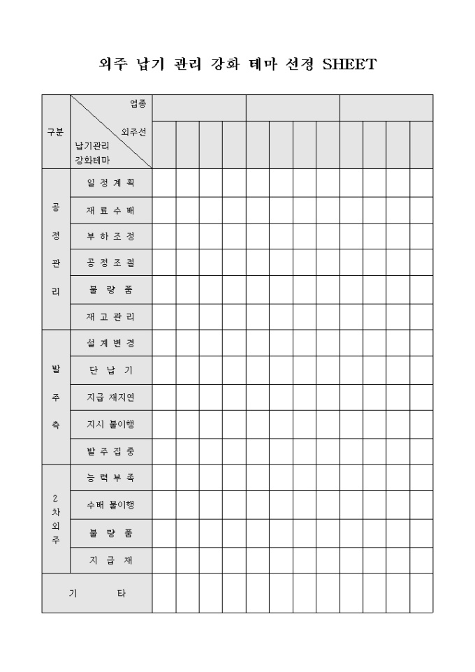 9,000원/월외주 업체에 대하여 납품 기한을 지키도록 관리를 강화하기 위한 외주 납기 관리 강화 테마 선정 SHEET 서식으로 외주 업체별로 납기 관리 강화 테마를 선정할 수 있습니다.
