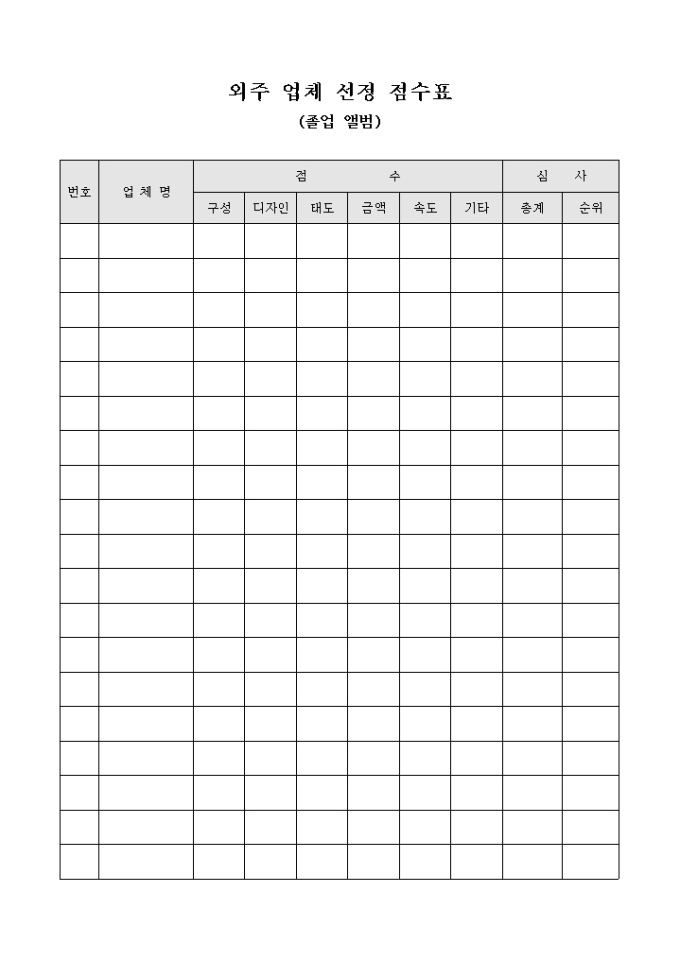 9,000원/월졸업 앨범의 제작을 위해 외주 업체를 선정할 때 각각의 외주 업체에 대하여 항목별로 점수를 기재하여 외주 업체 선정을 하기 위한 외주 업체 선정 점수표 양식입니다.