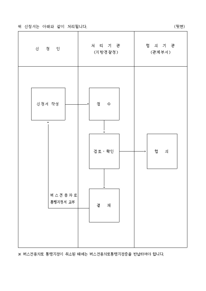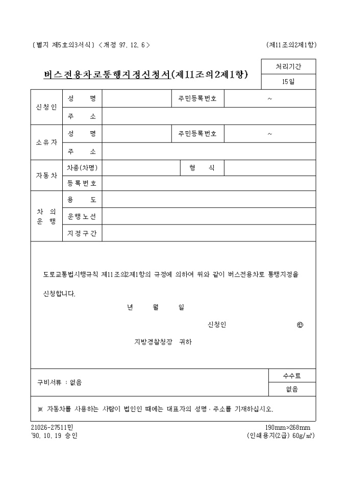 9,000원/월도로교통법시행규칙 제11조의2제1항의 규정에 의한 별지 제5호의3서식 버스전용차로통행지정신청서입니다.