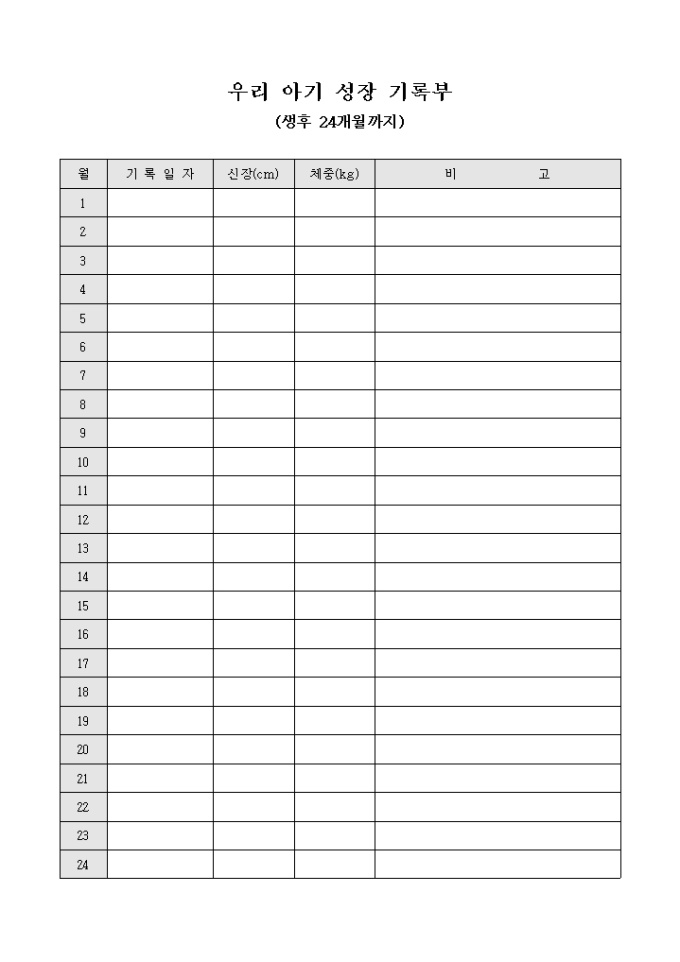 9,000원/월아기의 균형잡힌 성장을 위하여 생후 24개월까지 매월 신장 및 체중, 그에 관련된 비고사항을 기입할 수 있는 성장기록부 서식입니다.
