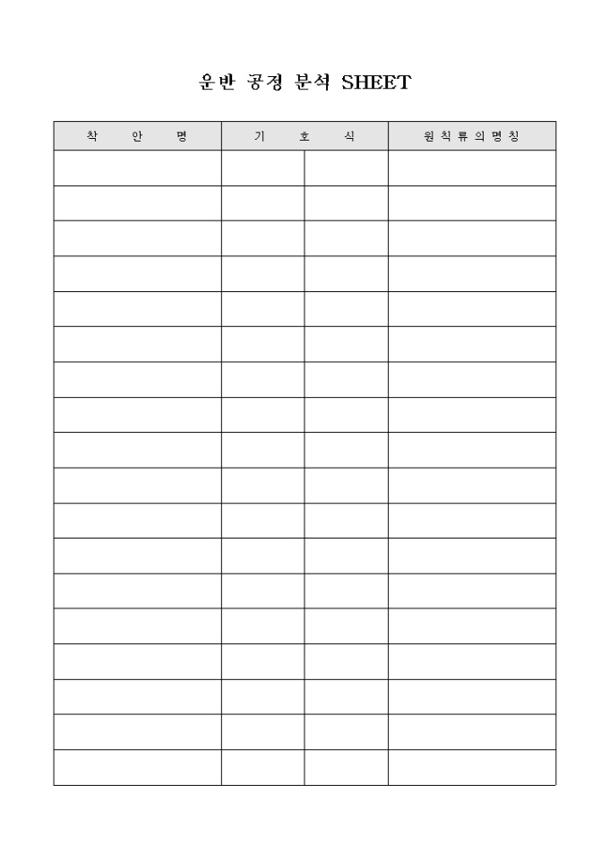 착안명, 기호식, 원칙류의 명칭 등의 사항을 기재하여 운반 공정을 분석하기 위한 운반 공정 분석 SHEET 양식입니다.