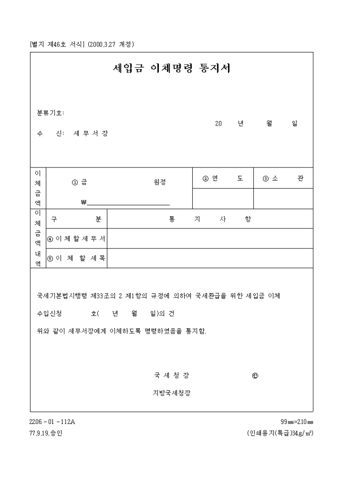 세입금이체명령통지서 양식입니다.