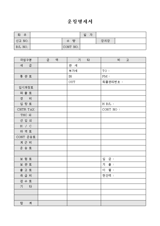 9,000원/월화주, 일자, 신고번호, 수량, 장치장 등의 항목을 기재하고 해당 작업 구분별로 금액을 기재할 수 있도록 구성된 운항 명세서 양식입니다.
