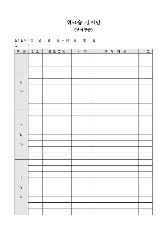 워크숍 기간 동안 실시할 프로그램과 세부내용을 기록할 수 있는 워크숍 실시안 양식으로 일차별로 실시할 프로그램과 시간, 세부내용을 기재할 수 있습니다.