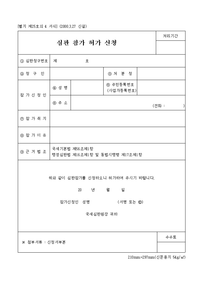 [별지 제25호의 4 서식] 심판참가허가신청 양식입니다. 국세기본법 제56조제1항 행정심판법 제16조제1항 및 동법시행령 제17조제1항 위와 같이 심판참가를 신청하오니 허가하여 주시기 바랍니다. ...
