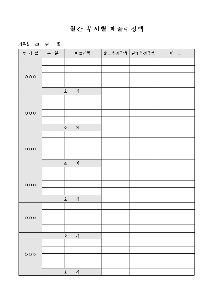 월간 부서별로 매출액을 추정하여 정리하고자 할 때 사용할 수 있도록 만들어졌으며 소계를 산출할 수 있게끔 제작된 서식입니다.