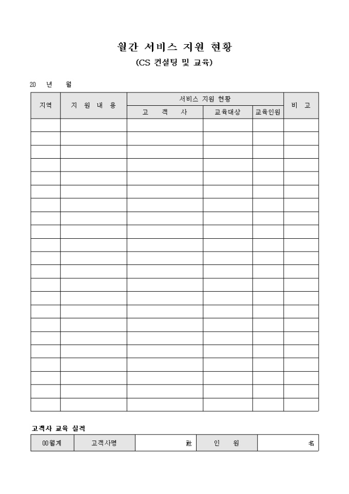 9,000원/월CS 컨설팅 및 교육 서비스에 지원한 인원에 대하여 현황을 파악하기 위한 월간 서비스 지원 현황 양식으로 지역 및 지원내용, 서비스 지원 현황 등의 항목을 기재할 수 있습니다.