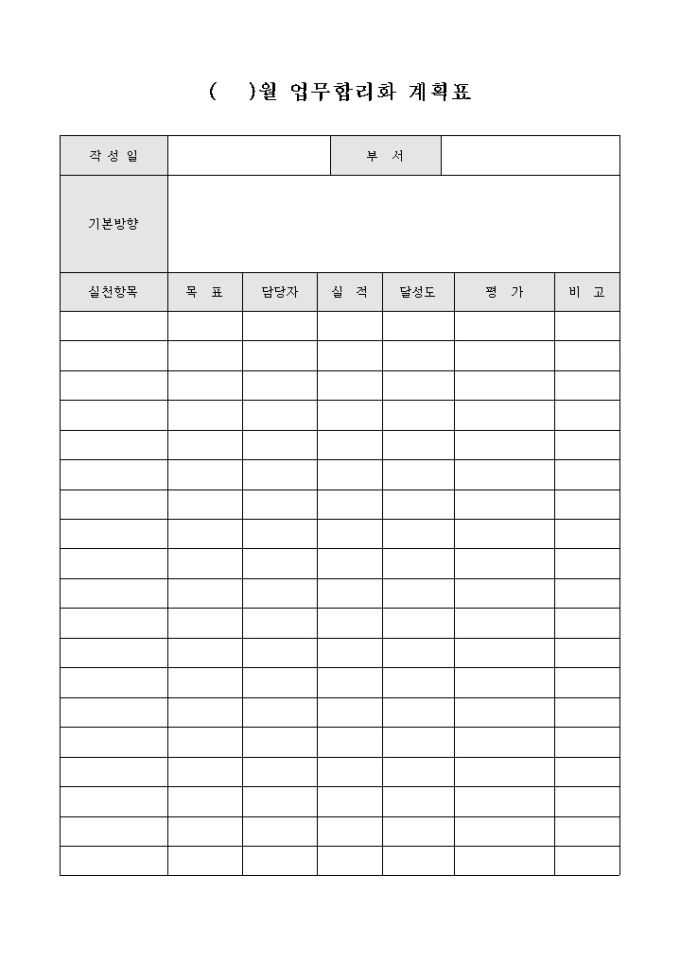 9,000원/월업무를 합리적으로 진행하기 위해 작성하는 계획표 서식으로 업무의 기본방향과 계획의 실천항목별로 목표 및 실적, 달성도, 평가 내용을 기재할 수 있습니다.