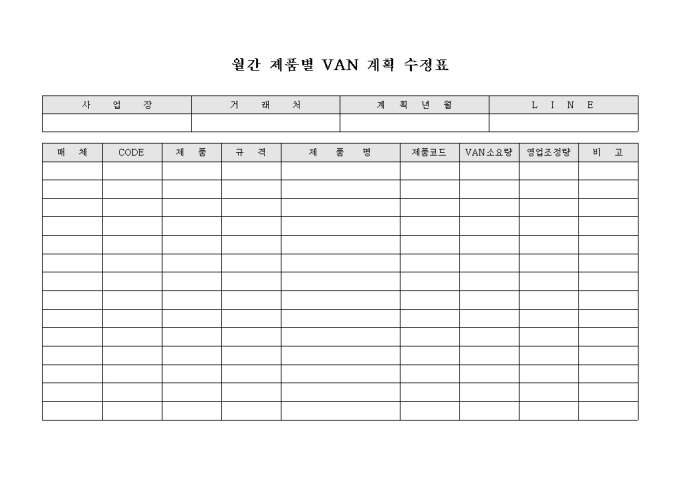 9,000원/월월간 제품별 VAN 계획 수정과 관련하여 사항을 정리하고자 할 때 사용할 수 있도록 만들어졌으며 소요량과 영업조정량 등의 항목을 기재할 수 있게끔 제작된 서식입니다.