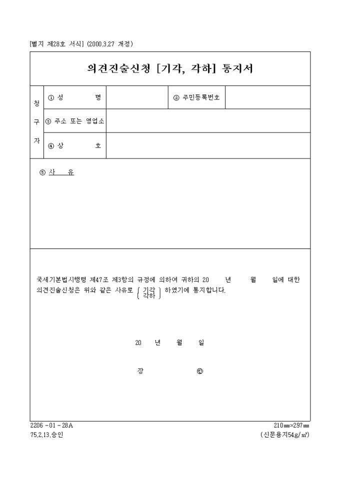 국세기본법시행령 제47조 제3항의 규정에 의하여 귀하의 20 년 월 일에 대한의견진술신청은 위와 같은 사유로 기각(각하) 하였기에 통지하실때 사용하는 양식입니다.