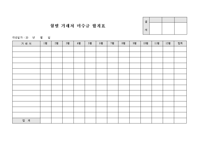 거래업체의 미수금을 월별로 기록 할 수 있도록 구성된 미수급 합계표 입니다.
