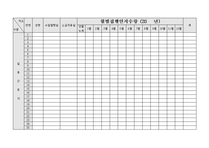 일용근로자들의 연간 집행인지 수량을 월별 표시할 수 있도록 구성된 월별 집행 인지 수량 양식입니다.