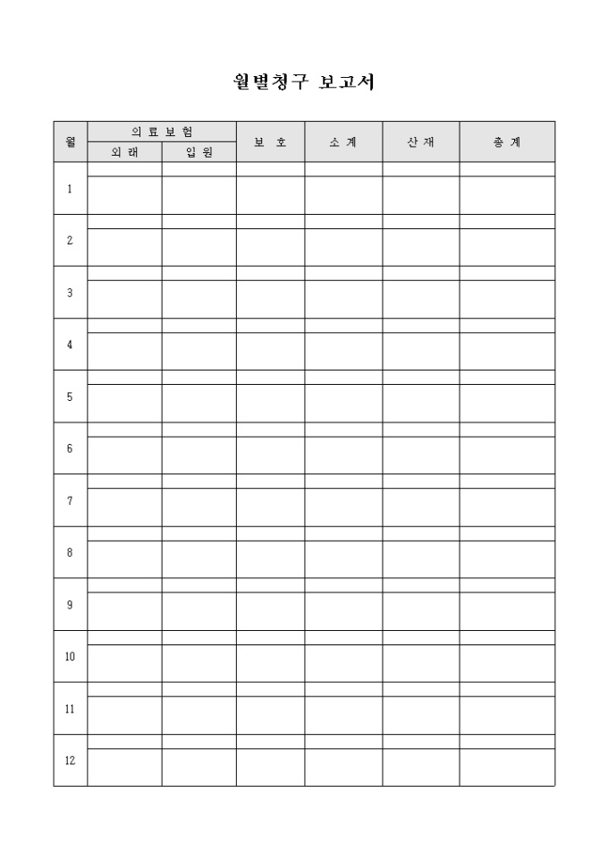 병원비를 청구하기 위한 보고서 양식으로 월별로 내역을 작성하여 청구 할 수 있으며 의료보험, 보호, 산재 등의 항목에 대하여 기재할 수 있습니다.