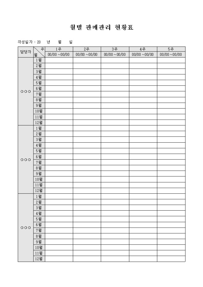 판매 관리 담당자의 월별 판매 관리 현황표 입니다. 주차별 판매 관리내용을 기록 할 수 있도록 구성되어 있습니다.