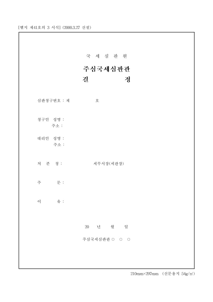 9,000원/월[별지 제41호의 3 서식] 주심국세심판관결정 양식입니다. 심판청구번호 : 제 호 청구인 성명 : 주소 : 대리인 성명 : 주소 : 처 분 청 : 세무서장(세관장)