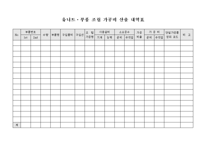 9,000원/월유니트 또는 부품의 조립에 대한 가공비를 산출하기 위한 내역을 기재할 수 있는 유니트?부품 조립 가공비 산출 내역표 양식입니다.